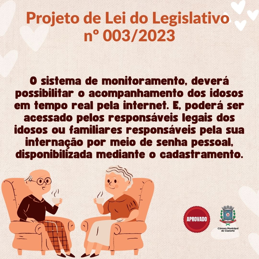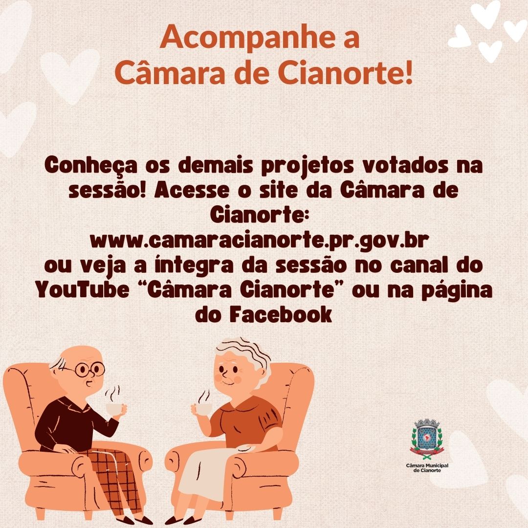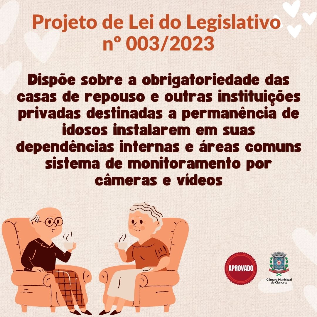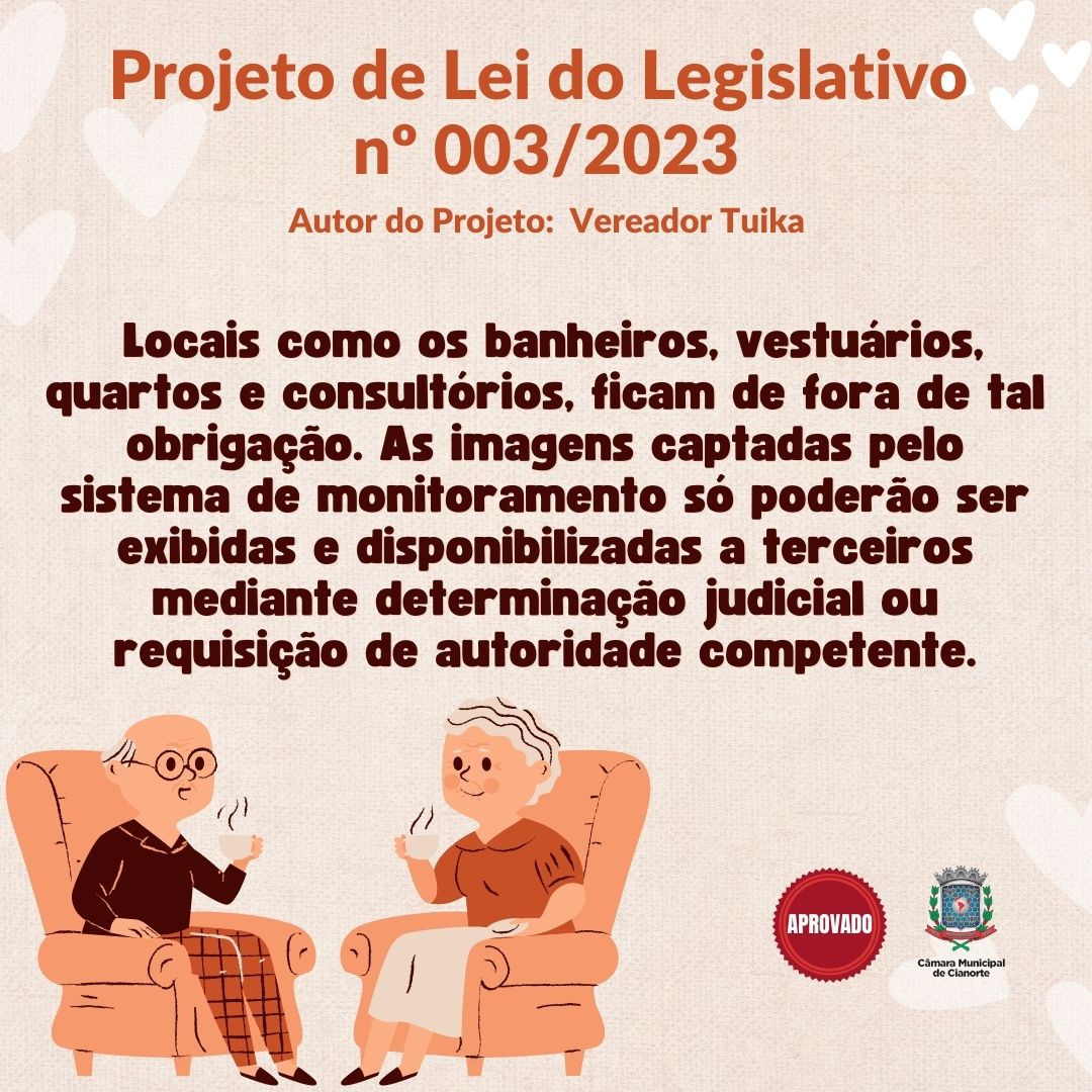 A sessão ordinária comandada pelo presidente Wilson Pedrão (Republicanos) nesta segunda-feira, 13, no Plenário da Câmara de Vereadores de Cianorte contou com a presença de todos os vereadores para a discussão de sete projetos de lei. De autoria do Poder Legislativo, houve a votação do Projeto de Lei do Legislativo nº 003/2023, de autoria do vereador Tuika (PV), que dispõe sobre a obrigatoriedade das casas de repouso e outras instituições privadas destinadas a permanência de idosos instalarem em suas dependências internas e áreas comuns sistema de monitoramento por câmeras e vídeos, que possibilite o acompanhamento dos idosos em tempo real pela internet.